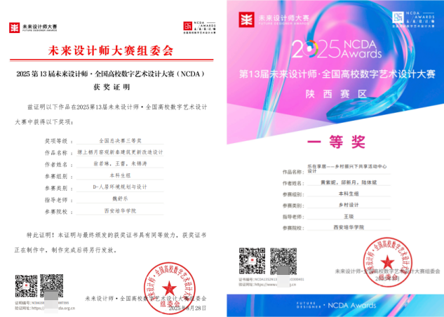 近日,第13届未来设计师?全国高校数字艺术设计大赛(NCDA)省赛圆满结束。我院建筑学专业学生表现突出,共获国家级三等奖1项、省级一等奖2项、省级三等奖5项,充分展现了我院学生扎实的专业基础与出色的创新能力。